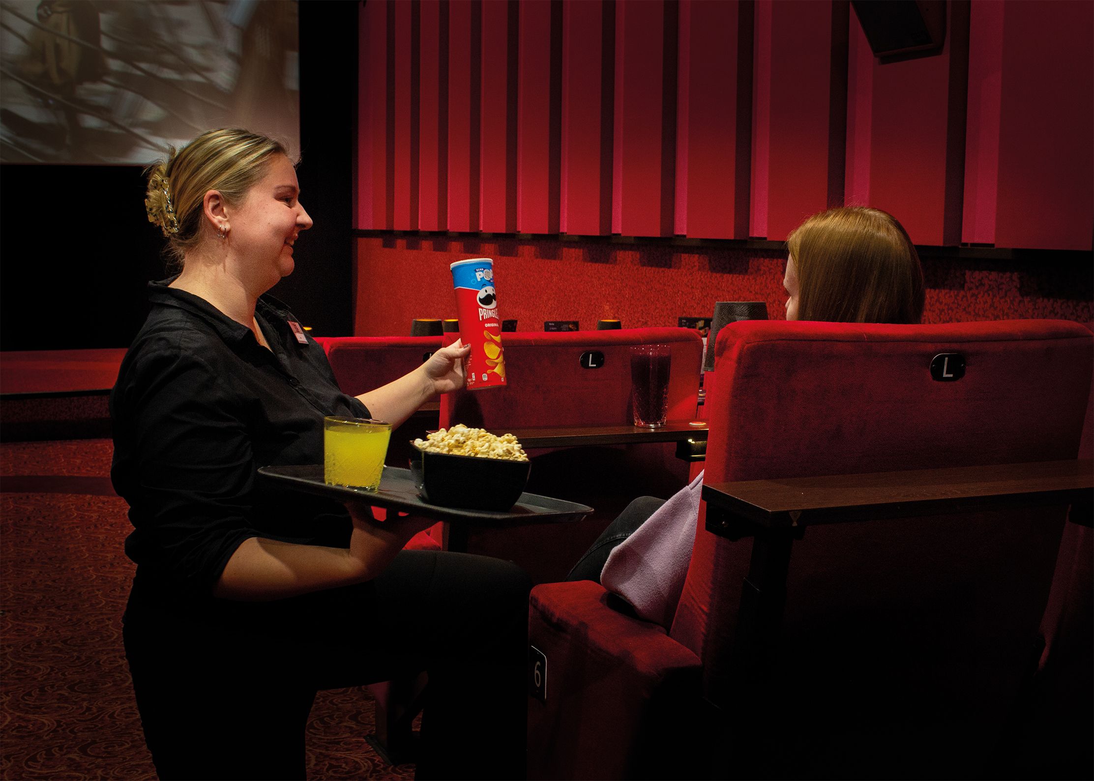 Wat ons bioscoopconcept uniek maakt, is het ongekend hoge serviceniveau. Gasten kunnen voor én tijdens de voorstelling gebruik maken van een uitgebreide menukaart. Een hapje en een drankje bestellen kan via de website, mobiele telefoon of door op de serviceknop te drukken. De bestelling wordt in de zaal uitgeserveerd, zodat gasten alleen maar hoeven te genieten. Daar stopt het verlenen van onze service niet. Gasten worden bij aankomst persoonlijk verwelkomd op hun plaatsen. Een luxe bioscoopstoel met stoffen bekleding met de mogelijkheid om een jas op te hangen. Bij Cine Twins geniet iedereen bovendien van relax fauteuils met elektrisch verstelbare rugleuning, voetensteun en draaibaar tafeltje, voor ultiem comfort tijdens de film.